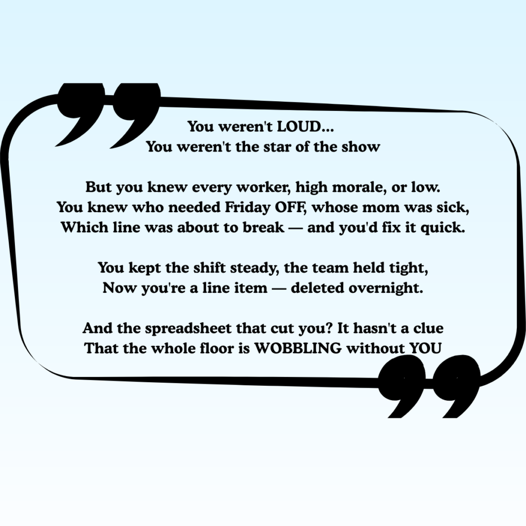You weren’t loud, you weren’t the star of the show, But you knew every worker, high morale, or low. You knew who needed Friday, whose mom was sick, Which line was about to break — and you’d fix it quick. You kept the shift steady, the team held tight, Now you’re a line item — deleted overnight. And the spreadsheet that cut you? It hasn’t a clue That the whole floor is wobbling without you.