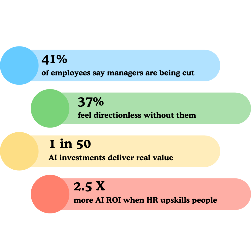 So the trade is: fire your middle managers, buy AI tools, and then discover the AI does not work as promised — with no one left to hold the team together in the meantime. That is not a strategy. That is a hostage situation where you have already paid the ransom.